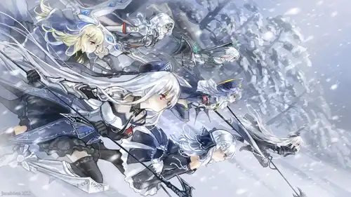 少女们双目中的赤色越发鲜艳,雪风吹动着她们雪色的头发。此刻,她们就如雪中精灵一般,窕立战场的边缘。