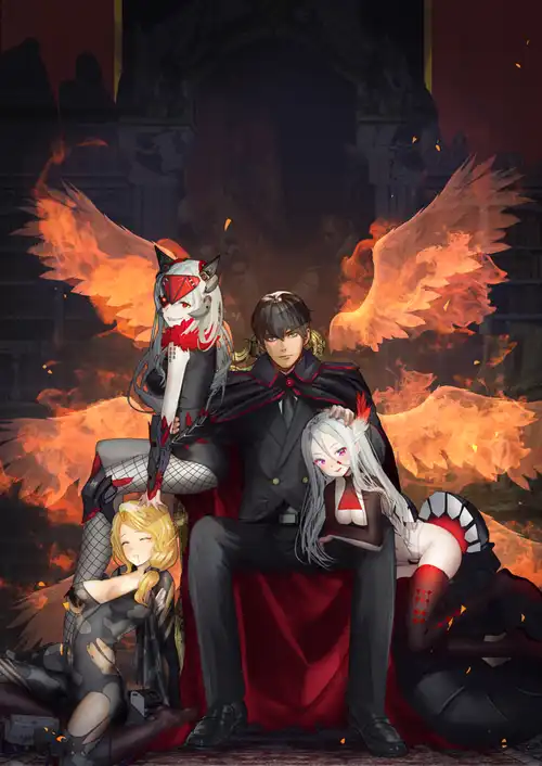背景为着火的《伊丽莎白之死》,俩黑色的机娘是前一张狐蝠娘和海鹞娘的恶堕版,米契沃尔手里抓着的是米菈。
