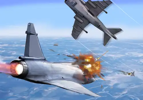 角度和距离都十分完美,鹞式开始上升,在几乎要贴上幻影的机腹时,鹞式开炮了。