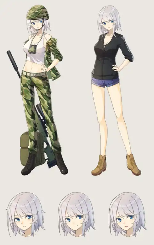她有着一双碧蓝色的大眼睛,银色微卷的头发被修剪至必要以下的长度,高挑的鼻梁、紧致的樱唇,再加上圆润的鹅蛋脸,勾勒出一张精美标致的脸。视线向下移动,映入眼帘的是一对虽没有到达马卡洛夫的等级,但也已经能和莉莎打个难解难分的巨乳,然而她的腰肢十分纤细,修长的双腿展现出野外作战所必须的灵活与强壮。