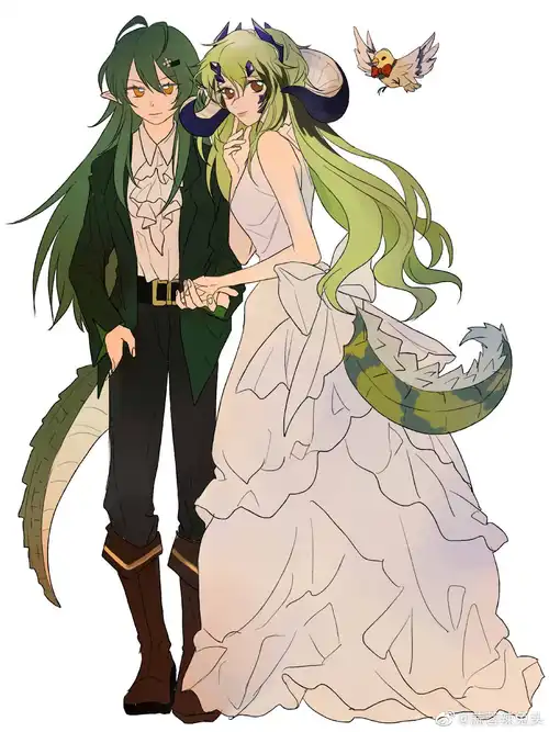 这么想着的嘉维尔缓缓走到房门口,她转过身来,发现穿着纯白长裙的“公主”此时正背对着她端坐在化妆台前,静静坐着的她看上去活像是一位静待爱人的新娘。她那及腰的枯绿色长发在白衣的映衬下显得鲜艳夺目,裙子后面的大蝴蝶结与她的长尾巴完美地搭配在一起。