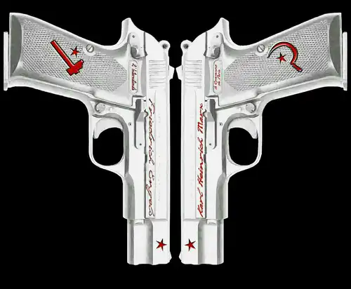 艾菲仔细端详起手里的枪,右手那把套筒上面刻的文字是“KarlHeinrichMarx”,握把上方的生产公司标识的位置被刻上了“LacommunedeParis”的字样,握把中央刻画的图案是镰刀加星星。与之相对的,左手那把刻的分别是“FriedrichEngels”,“L'Internationale”和锤子星星。